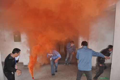 演練開始,信號組在得到演練命令后,立即發(fā)出火警訊號。同時(shí)在各個(gè)指定點(diǎn)放啟煙霧彈,樓梯道和走廊瞬間濃煙滾滾,各演練組在聽到逃生訊號后,在逃生組長的的組織下,迅速有序地從車間里往車間外疏散,每人用濕毛巾捂住嘴巴,彎腰匍匐前進(jìn),按規(guī)定的順序出了車間后分別從中線(沿樓梯道)和南線(沿走廊)繼續(xù)疏散,最后沖出煙區(qū)。救援組的人員跟隨疏散途中搶救了一名受傷人員(專人份演),在煙霧中,他們抬著擔(dān)架將傷員救出,到達(dá)指定地點(diǎn)集中,最后一名員工到達(dá)指定集合地點(diǎn)的時(shí)間是1分17秒。
