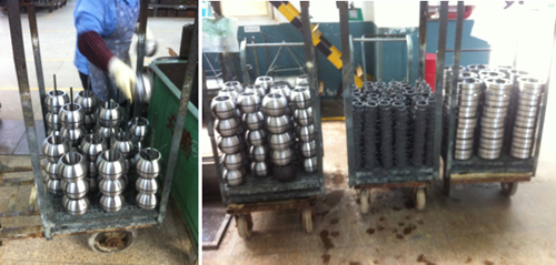 圖1 表面防護(hù)車間現(xiàn)場手工串料場景