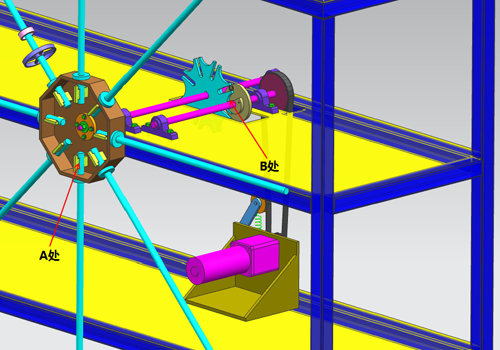 圖4為串料機(jī)構(gòu)的機(jī)械傳動(dòng)圖,其工作原理是:當(dāng)串料桿堆滿了套圈和隔套后,電機(jī)接到感應(yīng)開關(guān)的信號(hào)后啟動(dòng)并開始工作,通過同步帶驅(qū)動(dòng)槽輪機(jī)構(gòu)實(shí)現(xiàn)間歇式轉(zhuǎn)動(dòng),串料盤轉(zhuǎn)過45°后電機(jī)立刻停止,此時(shí)二次循環(huán)串料開始。圖中A處所示的串料盤有八根串料桿,可實(shí)現(xiàn)間歇式的連續(xù)串料工作,提高設(shè)備的工作效率;B處的槽輪機(jī)構(gòu),主要實(shí)現(xiàn)串料桿轉(zhuǎn)盤做固定角度45°間歇式擺動(dòng),起到輪換串料的功效,便于人工卸下滿料桿和更換空料桿。