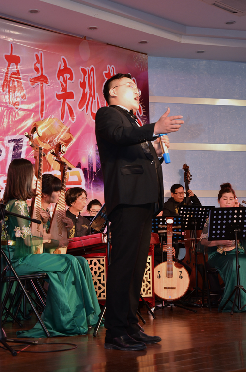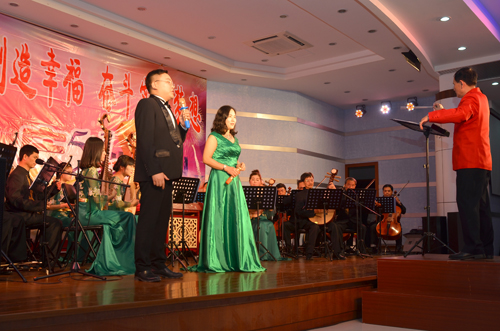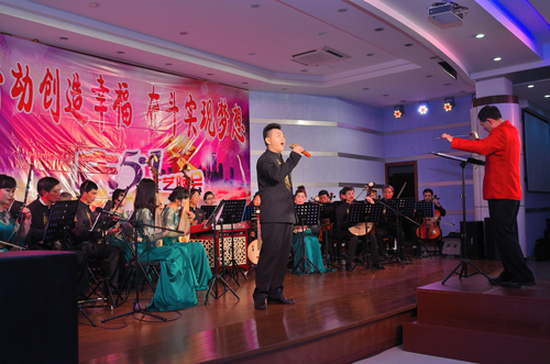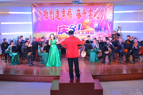 當(dāng)晚,公司俱樂部燈光璀璨,樂聲歡騰。隨著強(qiáng)勁的鼓點(diǎn)響起,開場(chǎng)舞《騰龍鼓樂》拉開了整場(chǎng)晚會(huì)的序幕,隨后,公司“老”歌手曾艷輝及團(tuán)委組建的舞蹈隊(duì)帶來了精彩的歌伴舞《雙腳踏上幸福路》,“新”歌手張錚聲情并茂地演繹了歌劇《江姐》選段《我為共產(chǎn)主義把青春貢獻(xiàn)》及民歌《桃花紅杏花白》,龍通藝術(shù)團(tuán)的歌手李紅英、吳罕帶來的獨(dú)唱《好日子》、《我愛你中國(guó)》喜慶激昂,羅斌峰的笛子獨(dú)奏《牧民新歌》及樂團(tuán)現(xiàn)場(chǎng)演奏的《龍江歡歌》、《紅樓夢(mèng)插曲》、《蘇南小調(diào)》余音繞梁,男歌手熊凱、溫?zé)ㄕ竦哪新暘?dú)唱《格桑梅朵》、《懷念戰(zhàn)友》、《駿馬奔馳保邊疆》、中央民族大學(xué)聲樂碩士郭源源為大家?guī)淼摹逗oL(fēng)陣陣》、《一杯美酒》大氣悠揚(yáng)。