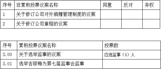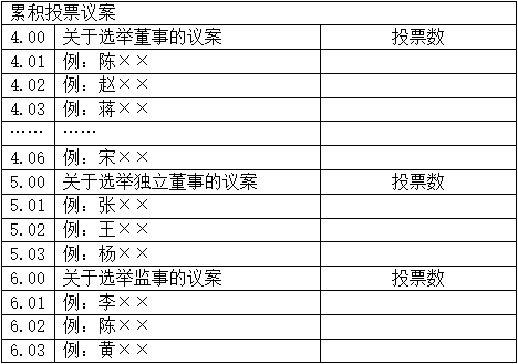 三、股東應以每個議案組的選舉票數(shù)為限進行投票。股東根據(jù)自己的意愿進行投票,既可以把選舉票數(shù)集中投給某一候選人,也可以按照任意組合投給不同的候選人。投票結束后,對每一項議案分別累積計算得票數(shù)。