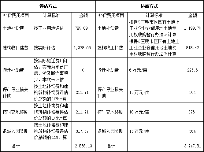 福建省三明齒輪箱有限責任公司陳大鎮(zhèn)廠區(qū)工業(yè)用地征遷補償方式對比表