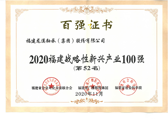 2020年11月20日,2020福建企業(yè)100強發(fā)布大會暨福建企業(yè)家大講壇在寧德市舉辦。會上,福建省企業(yè)與企業(yè)家聯(lián)合會聯(lián)合、福建省社會科學院、福建省廣播影視集團聯(lián)合發(fā)布的“2020福建戰(zhàn)略性新興產業(yè)領軍企業(yè)100強”榜單中,福建龍溪軸承(集團)股份有限公司位列榜單第52名。