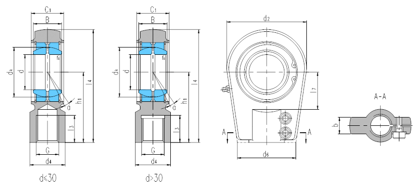 產(chǎn)品特點:帶鎖口桿端關(guān)節(jié)軸承由桿端體和向心關(guān)節(jié)軸承GE…ES組裝而成,用擋圈固定,d≤50,桿端體材料是碳鋼,d>50,桿端體材料是球墨鑄鐵,桿端體的內(nèi)螺紋帶有鎖口,配有螺釘緊固;可通過油杯潤滑。