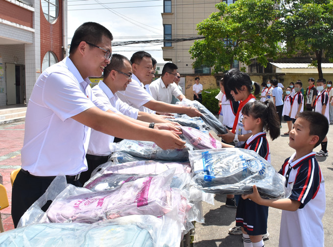 在“助力鄉(xiāng)村振興捐贈儀式”上,劉明福、王志劼代表公司向埭尾村捐贈12萬元,用于埭尾村路燈設(shè)施工程建設(shè),為幫助照亮埭美古村旅游之路做出龍軸貢獻。隨后,劉明福一行移步埭尾小學(xué)開展歡慶“六一”國際兒童節(jié)助學(xué)捐贈活動,代表公司向校方捐贈了3萬元改善教學(xué)條件資金,為全校181名學(xué)生購買了新書包,并給予6名困難學(xué)生共6000元助學(xué)金。望著孩子們一張張陽光燦爛的笑臉,劉明福一行勉勵孩子們勤奮學(xué)習(xí)、立志成才,以優(yōu)異的成績回報家鄉(xiāng),同時向辛勤耕耘、播灑未來的老師們致以了崇高的敬意。