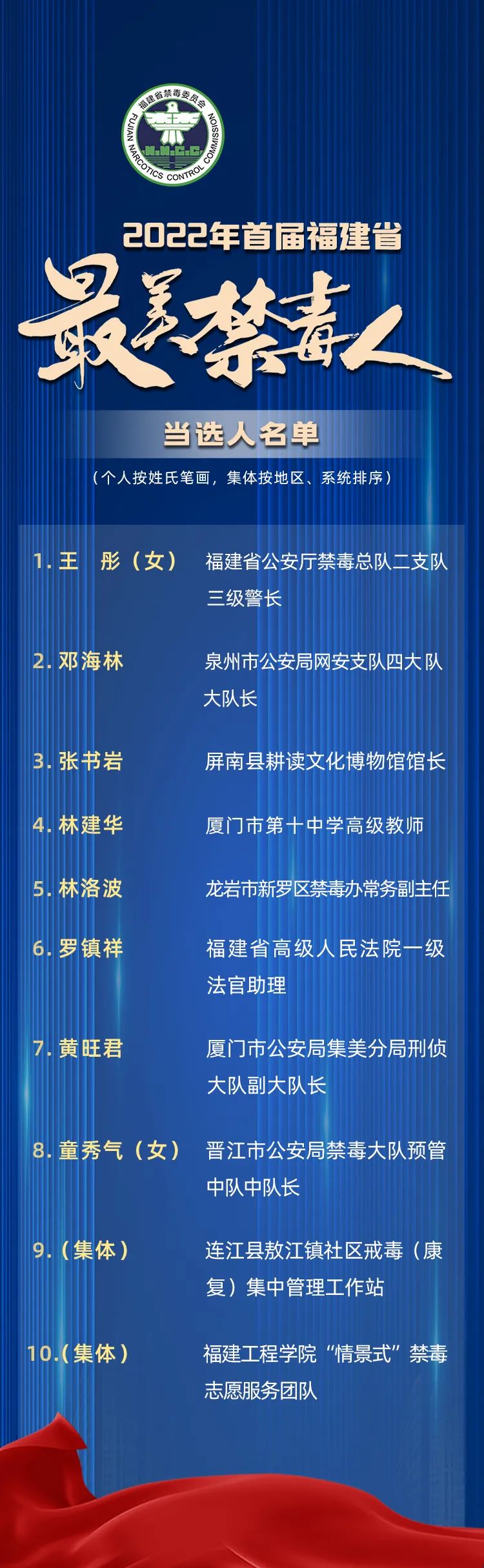 按照《關(guān)于組織開展全省首屆“最美禁毒人”宣傳推選活動的通知》要求,經(jīng)基層推薦、組織初審、網(wǎng)絡(luò)投票、專家評審等程序,中共福建省委宣傳部、福建省禁毒委員會辦公室確定了2022年首屆福建省“最美禁毒人”10名當選人、10名提名獎獲得者最終獲評名單?,F(xiàn)將名單予以公示,接受監(jiān)督。如有異議,請在公示期限內(nèi),通過來信、來電等方式,實名反映情況。