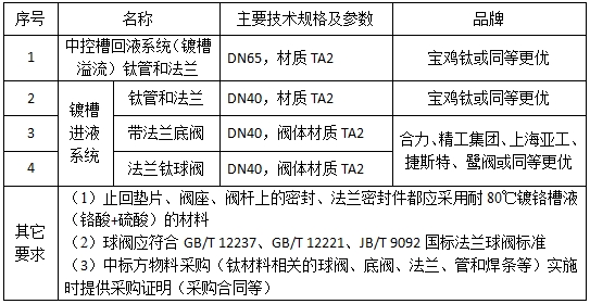 自動鍍鉻生產(chǎn)線現(xiàn)有鍍槽-中控槽鍍液循環(huán)系統(tǒng)塑料材質(zhì)管道(管道、接頭與閥體)使用到一定年限老化,其中的溢流管路、回液管路及閥件將更新為鈦材料。