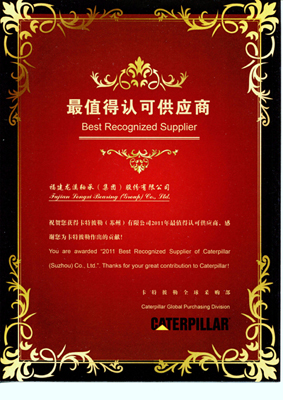On Nov. 25,2011, Our general manager Xiasheng Xu came to Xuzhou to attend the Caterpillar supplier conference. At the conference, Caterpillar (Suzhou) Co., Ltd. Granted our  company “ Best Recognized Supplier” as the honorary title. This represents that our products and service have been fully recognized by International machinery giant Caterpillar, and shows that our economic and trade ties now stand at a new starting line.
