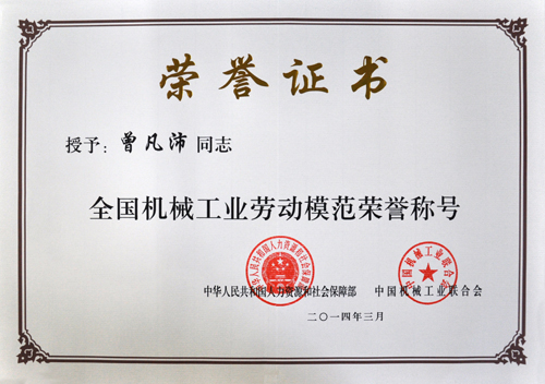 第二屆全國機械工業(yè)勞動模范表彰大會近期在北京召開,公司董事長曾凡沛榮獲“全國機械工業(yè)勞動模范”稱號,該獎由中華人民共和國人力資源和社會保障部、中國機械工業(yè)聯(lián)合會聯(lián)合評選,以表彰全國機械工業(yè)出類拔萃的工作者。