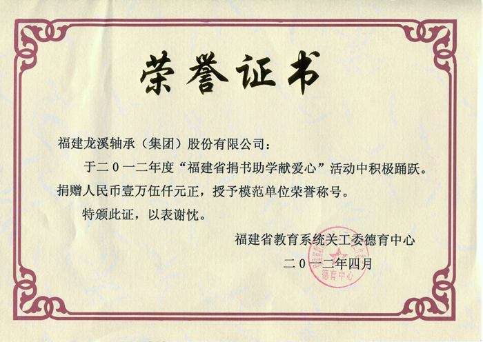 二O一二年度福建省捐書助學(xué)獻(xiàn)愛心活動(dòng)模范單位證書